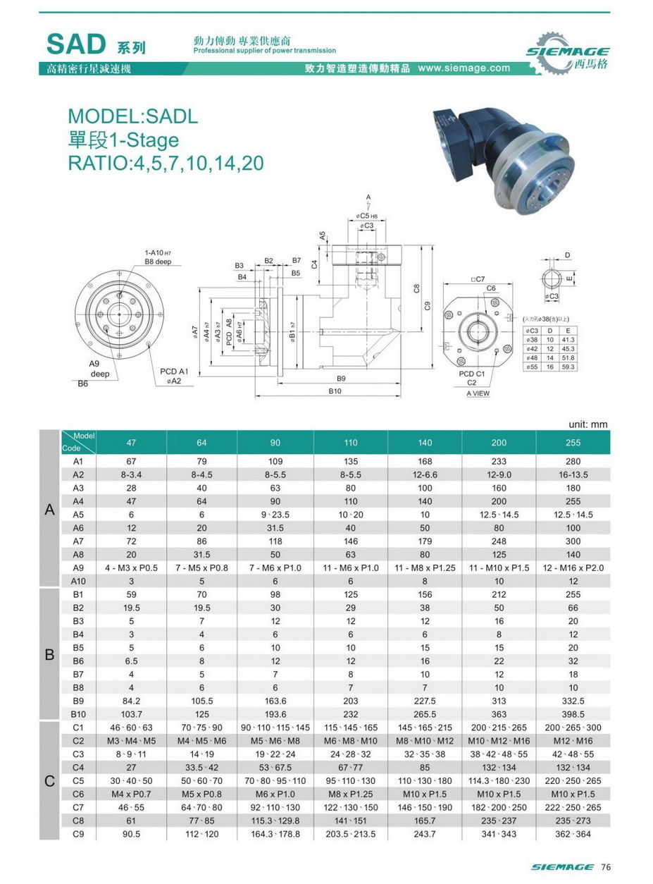 西马格直角行星减速机7种可选尺寸:47MM-255MM